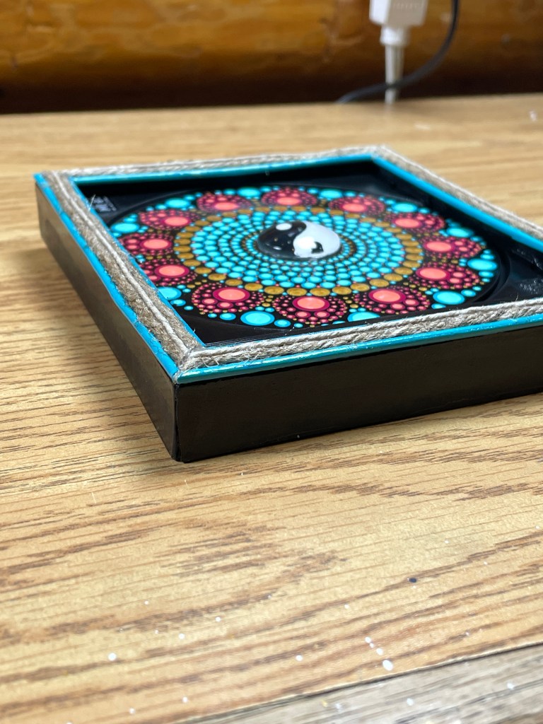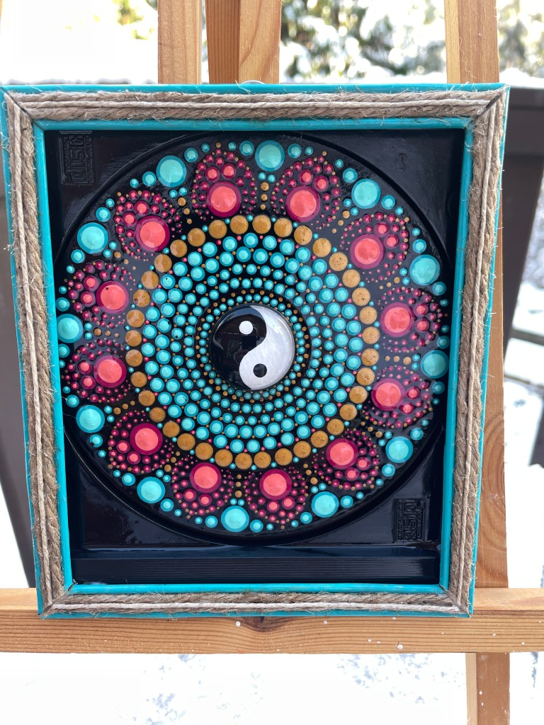 I have spent the last couple of weeks working out how to turn the inside part of a CD case into a functional piece of art. What I came up with was a picture frame. Then the painted CD can be showcased in the very thing that was designed to hold it in places in the case.