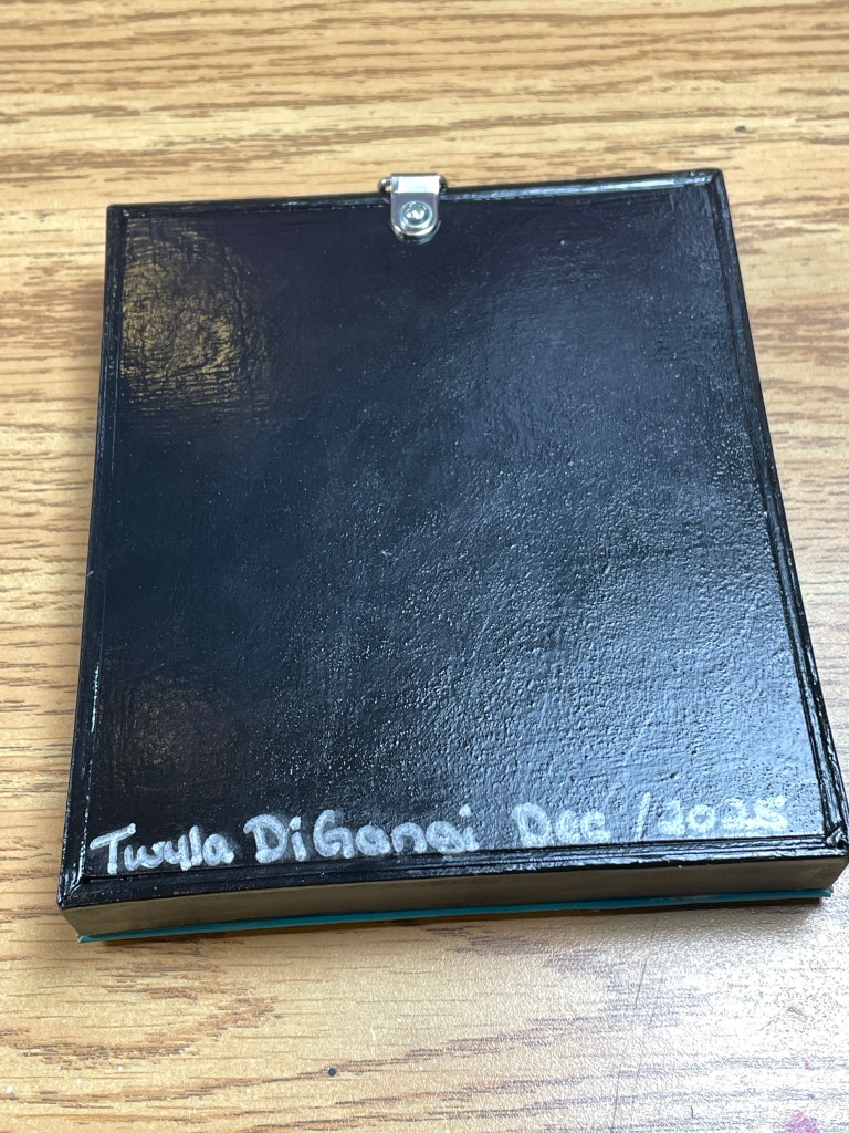 Then you must place the CD into the holder before you add the top frame. This is because the top frame is just a little wider and if you add it first you won’t be able to get the CD inside. Once the CD is placed inside the case you can then glue the top frame into place. Once all the glue has dried completely, I then coated it in clear coat and added the hook on the back to be able to hang it.